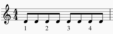 ⇩こちらは、4/4拍子の楽譜で1小節に8分音符だけが並んでいます。8分音符4つがつながっていますね。