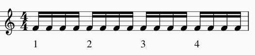 ⇩こちらも4分の4拍子の楽譜で、1小節に16分音符だけが並んでいます。