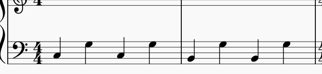1小節目:左右でリズムは同じ、違う音(右は同じ音、左は音が変わる)